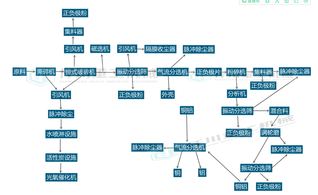 仟川重工鋰電池回收設備中預處理包括:放電拆解系統(tǒng)、入料機、集流體分選機、金屬分離機、輸送機、粉碎機、破碎機、磁選機、集塵器、篩分機、氣流分選機、脈沖凈化器以及全自動監(jiān)控器。