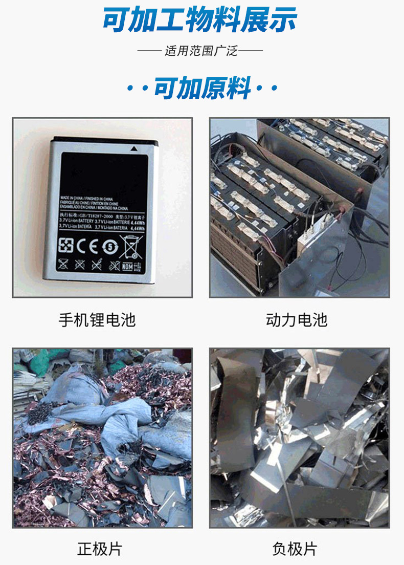 ? ?仟川重工專注鋰電池回收處理設(shè)備、鋰電池片回收處理設(shè)備生產(chǎn),設(shè)備各項性能不斷的優(yōu)化,目前可為大型回收商做配套處理。整機(jī)使用更是性能穩(wěn)定,回收效果好,省時省力,一站式解決了您在鋰電池處理上的難題。
